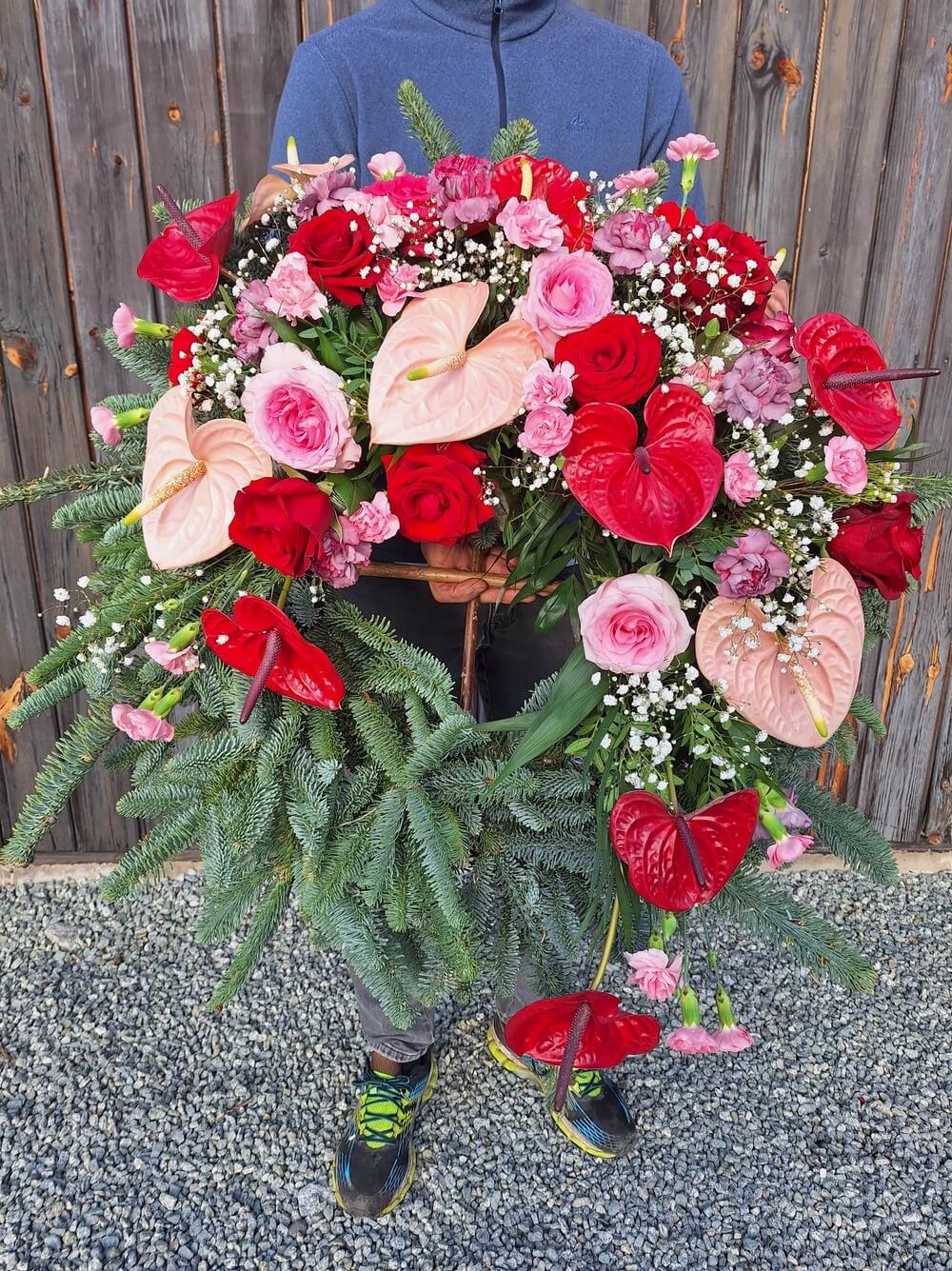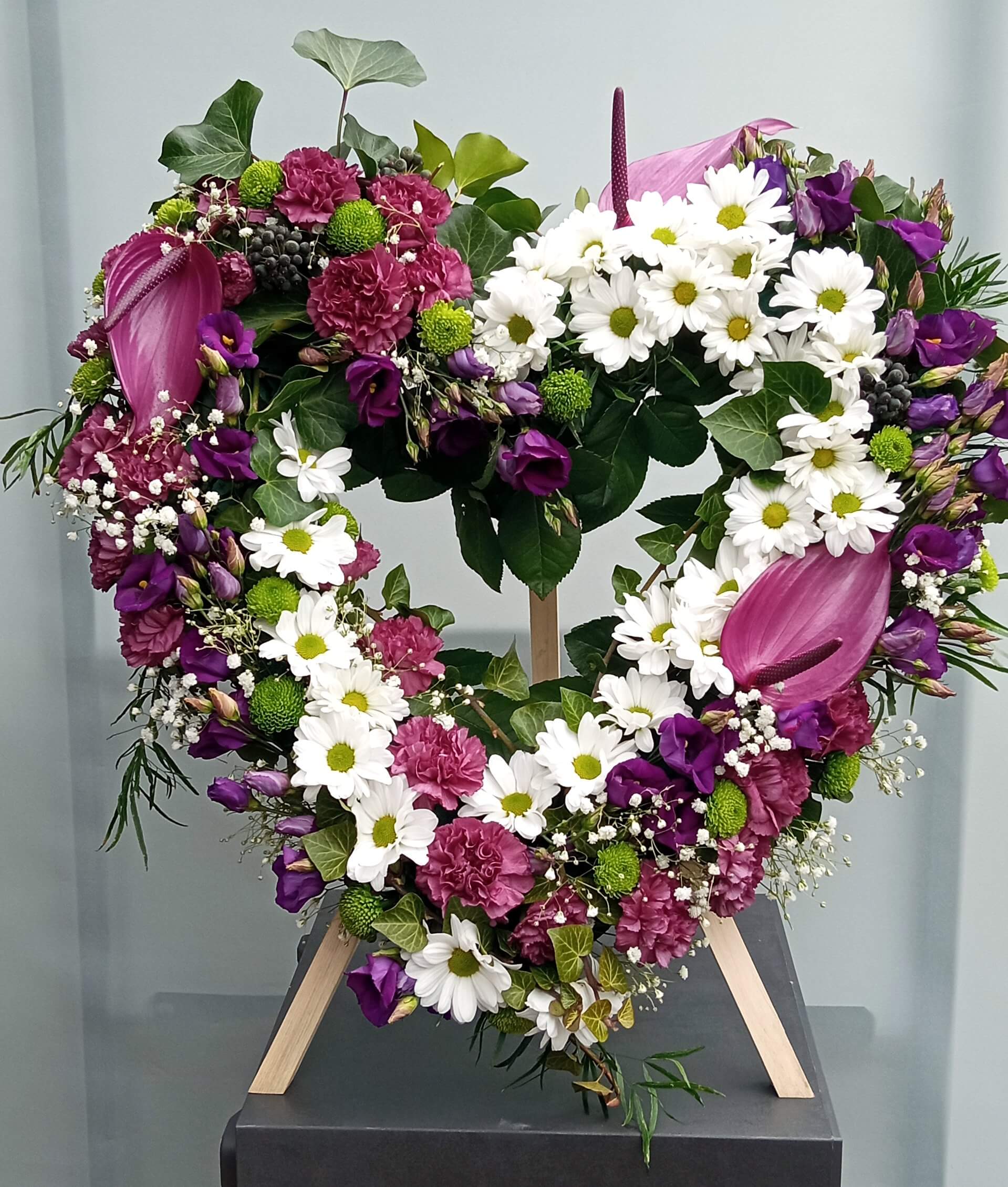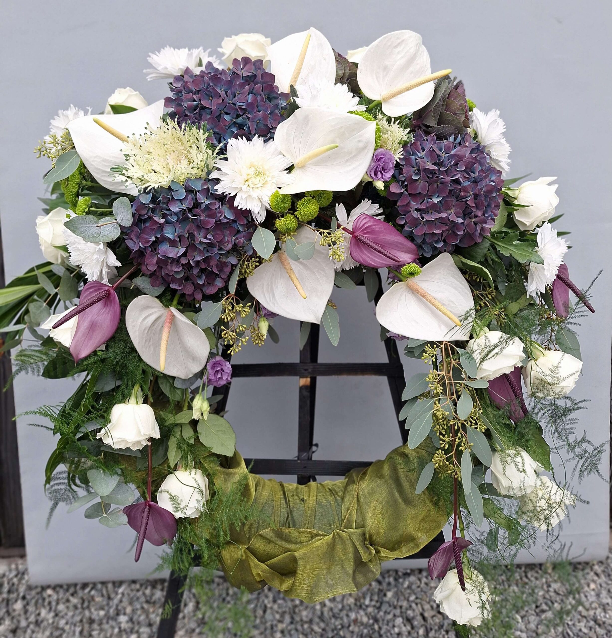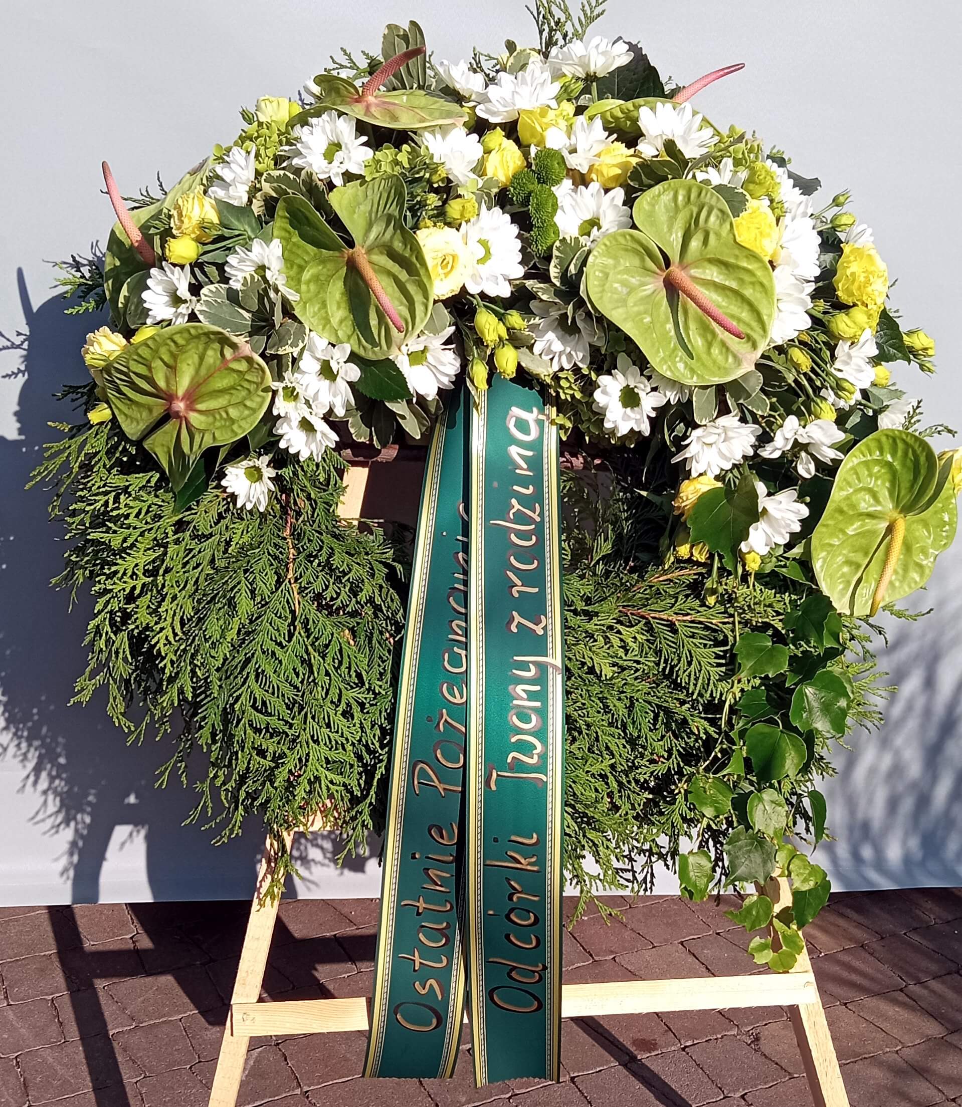 - Okrągłe wieńce z anturium: Eleganckie i subtelne, idealne do wyrażenia szacunku i współczucia.