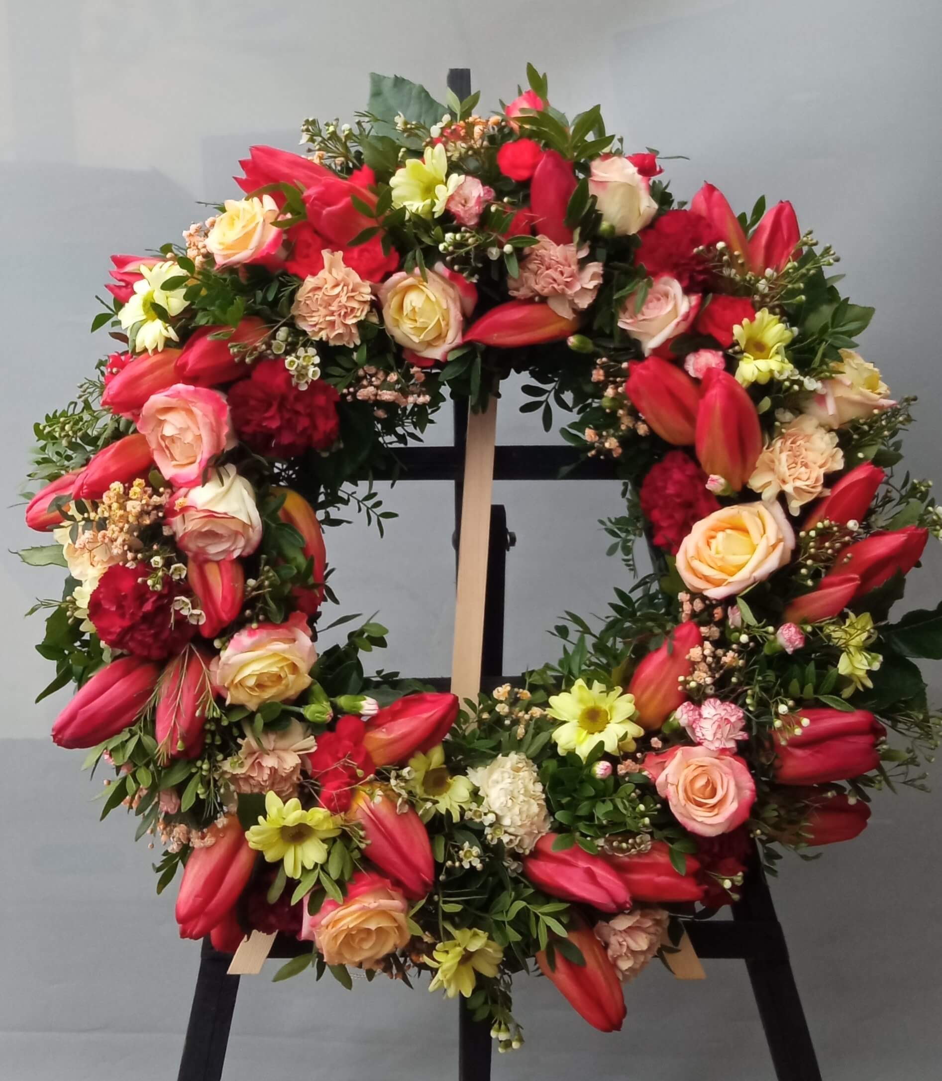 - Wieńce z chryzantem: Chryzantemy są symbolem pamięci i trwania, doskonale nadają się na wieńce pogrzebowe.